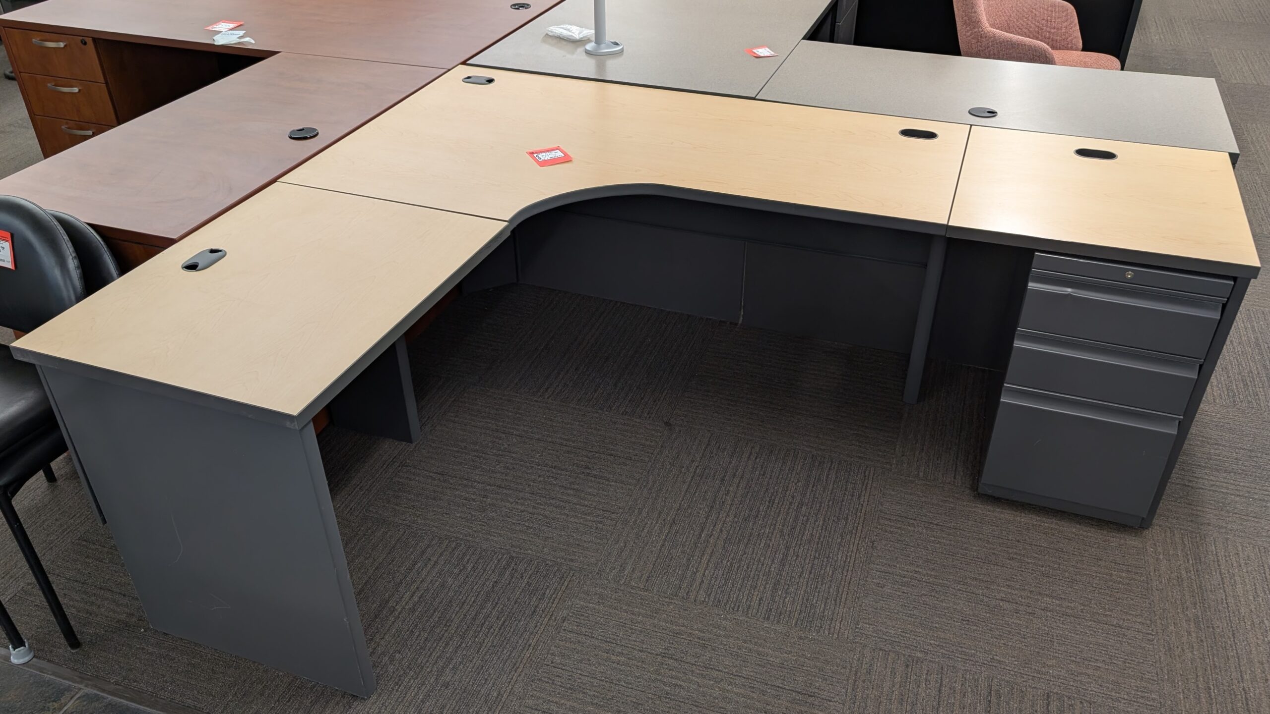 Allsteel Maple/Charcoal L-Shape Desk Set w/ 1 Pedestal – Used