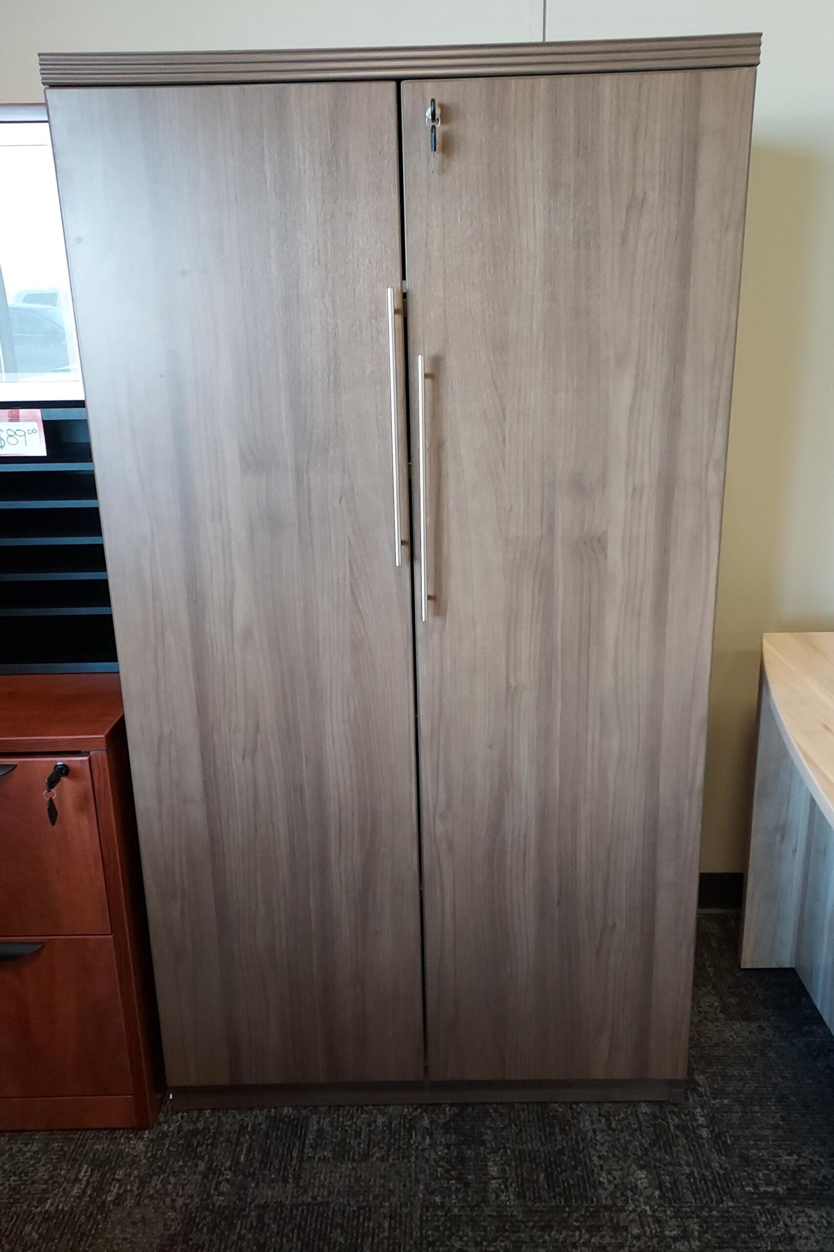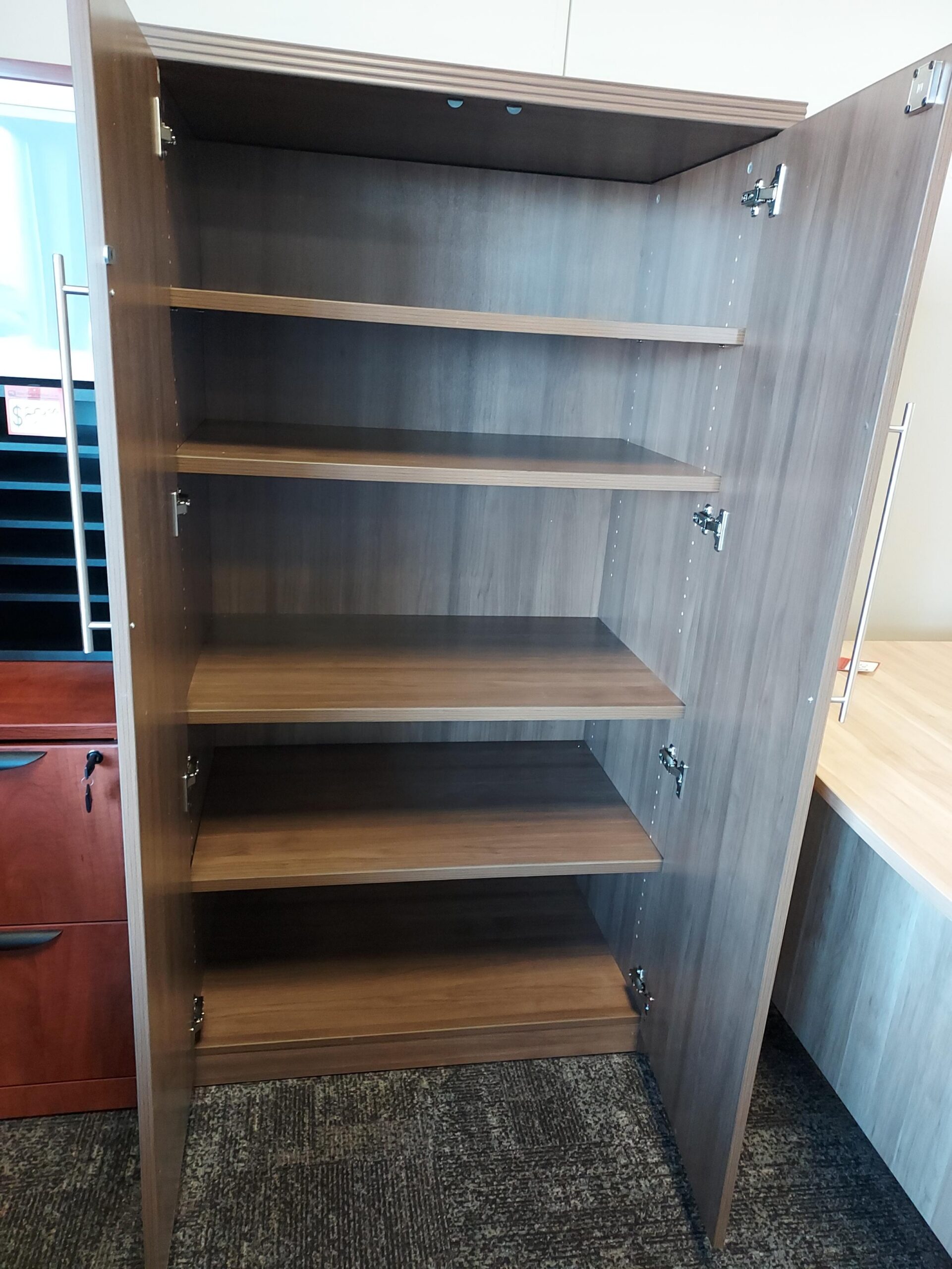 Express Office Furniture “Status” series, new storage cabinet. Model S651 22″ deep x 36″ wide x 66″ tall Modern Walnut laminate, Adjustable shelves, lock/key, Discontinued Model.