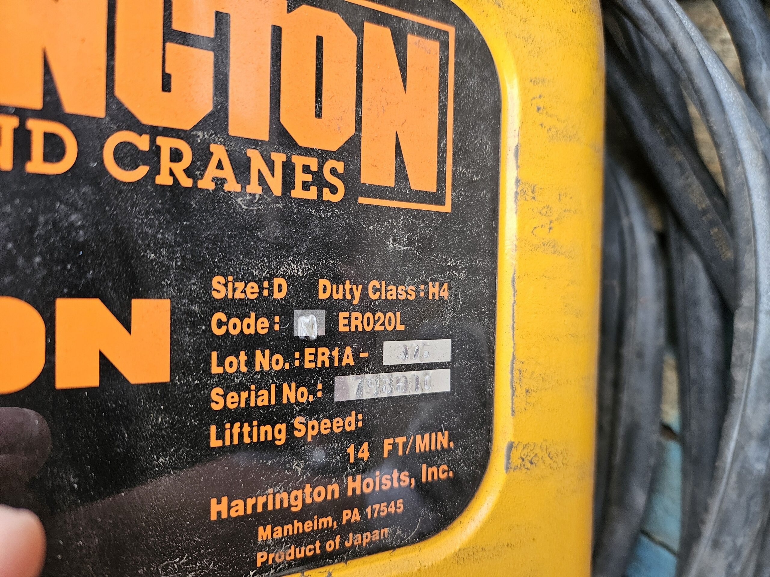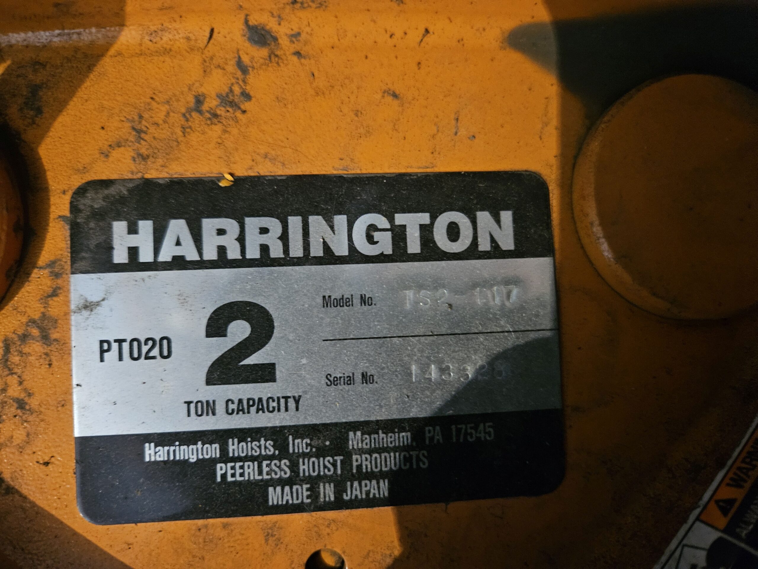 Harrington ERO20L 2-Ton Electric Chain Hoist withTS2-117 Manual Push Trolley – Used