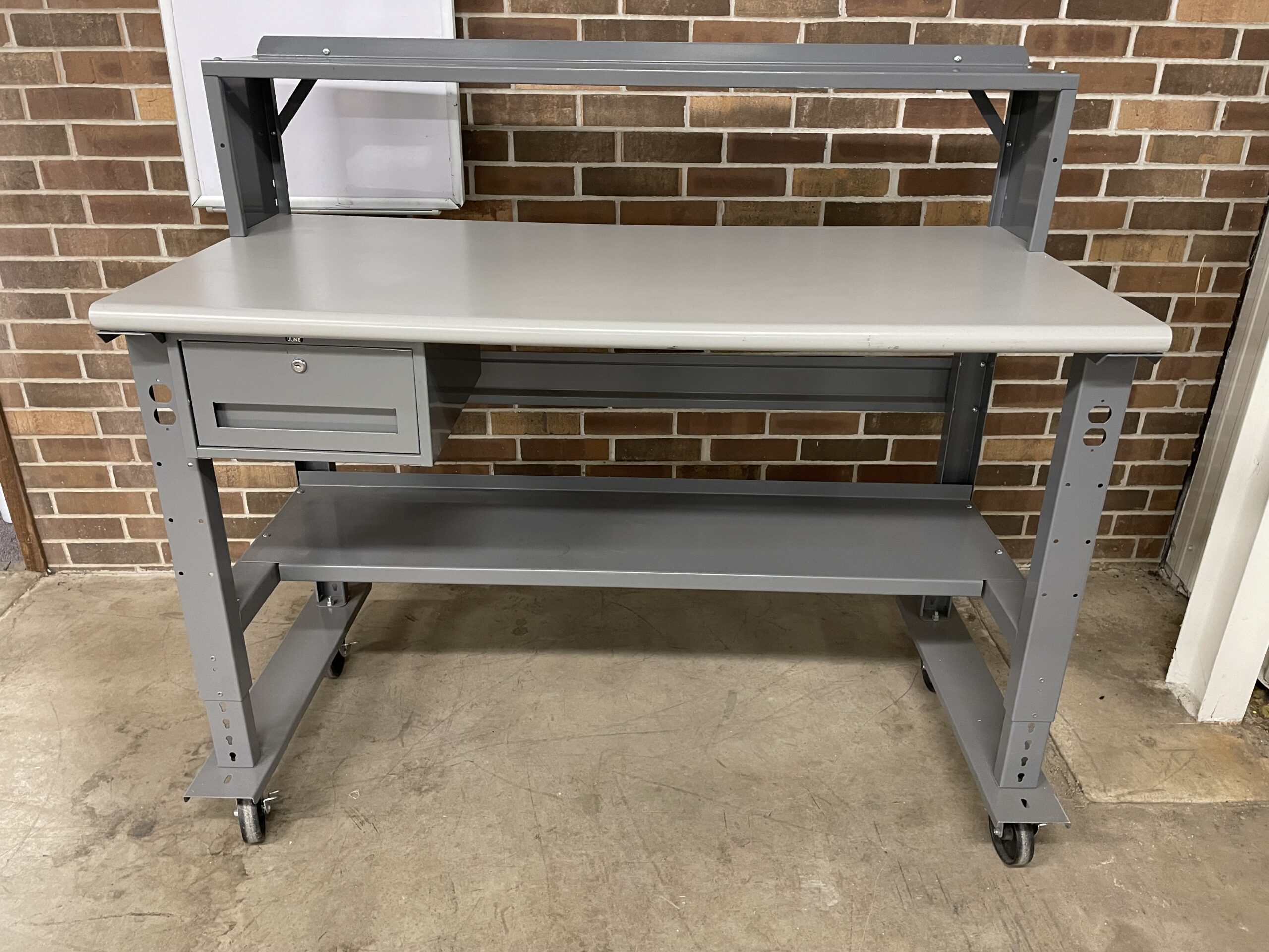 Industrial Packing Table 60″ x 30″ Laminate Top, Upper Shelf & Casters – Used