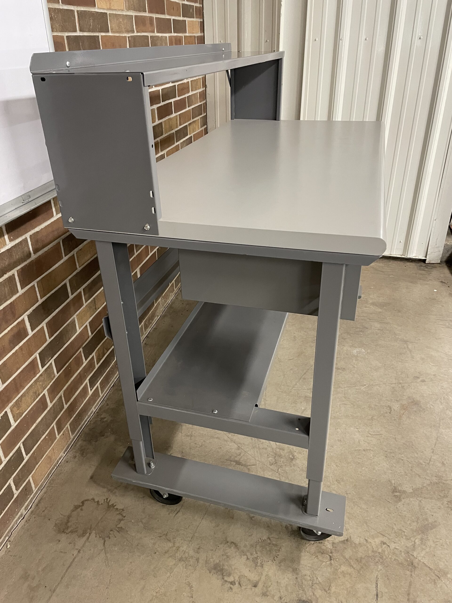 These used 30″x60″ used Packing tables are in very good used condition. They may have a few scratches, scuffs or chips in the laminate top but they are overall very nice. They feature an upper shelf, lower shelf and casters for portability. They are also adjustable from 36″-42″ Tall.