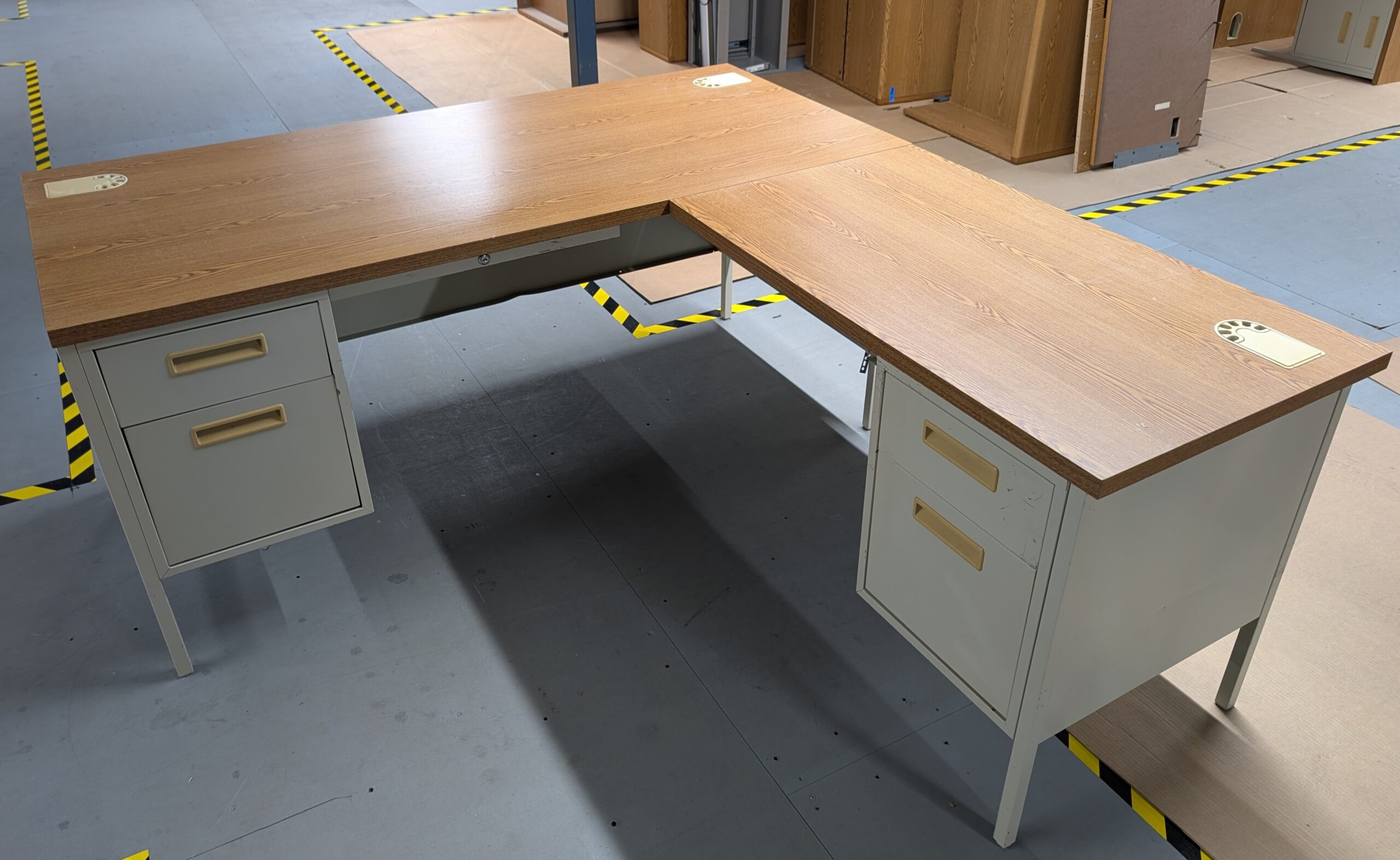 Oak Laminate Steel L-Shape Desk w/ Hanging Peds & Pencil Drawer - Used quantity
