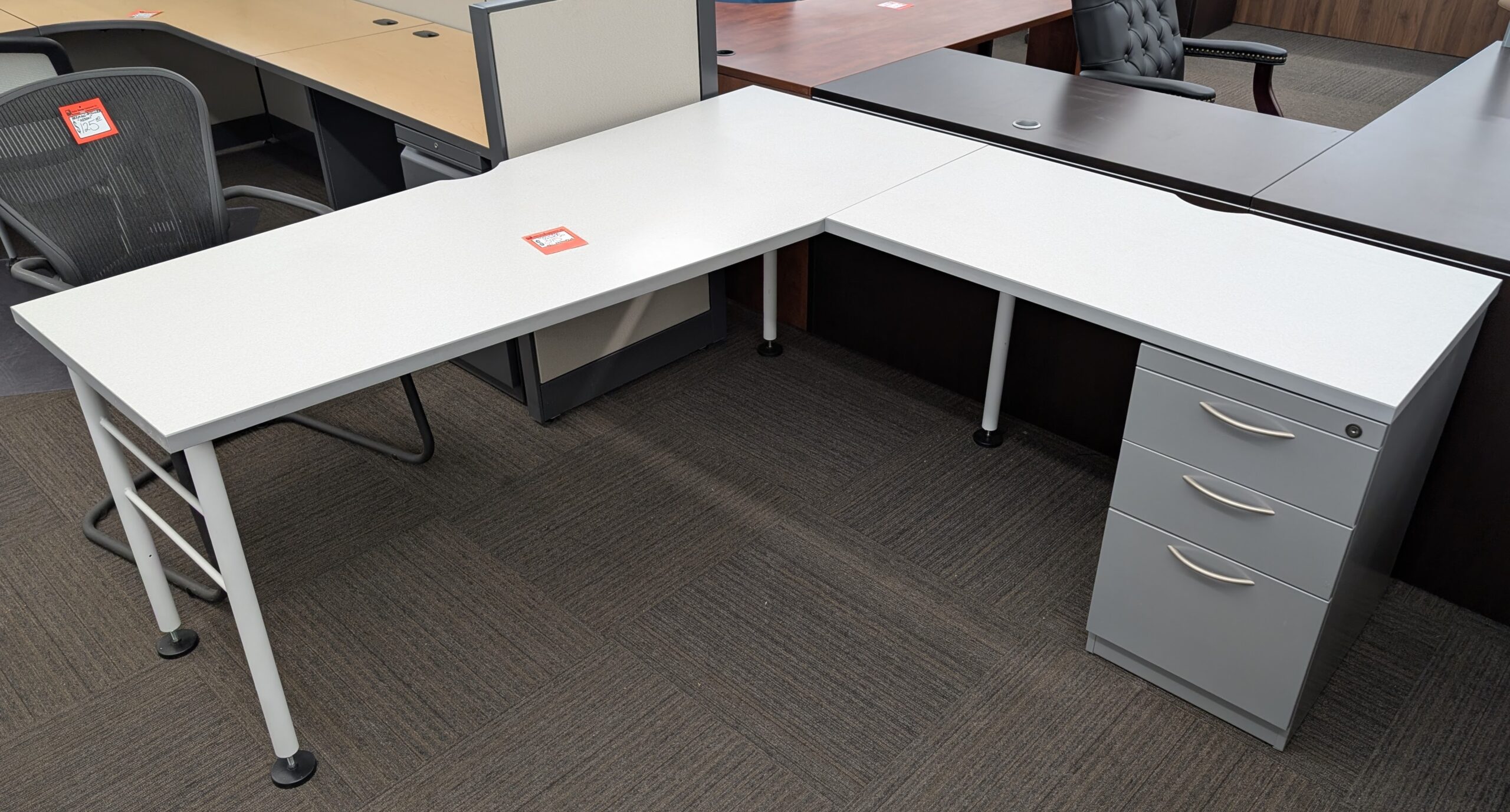Steelcase Answer White/Silver 6’x6′ Tapered L-Shape Desk w/ Ped – Used