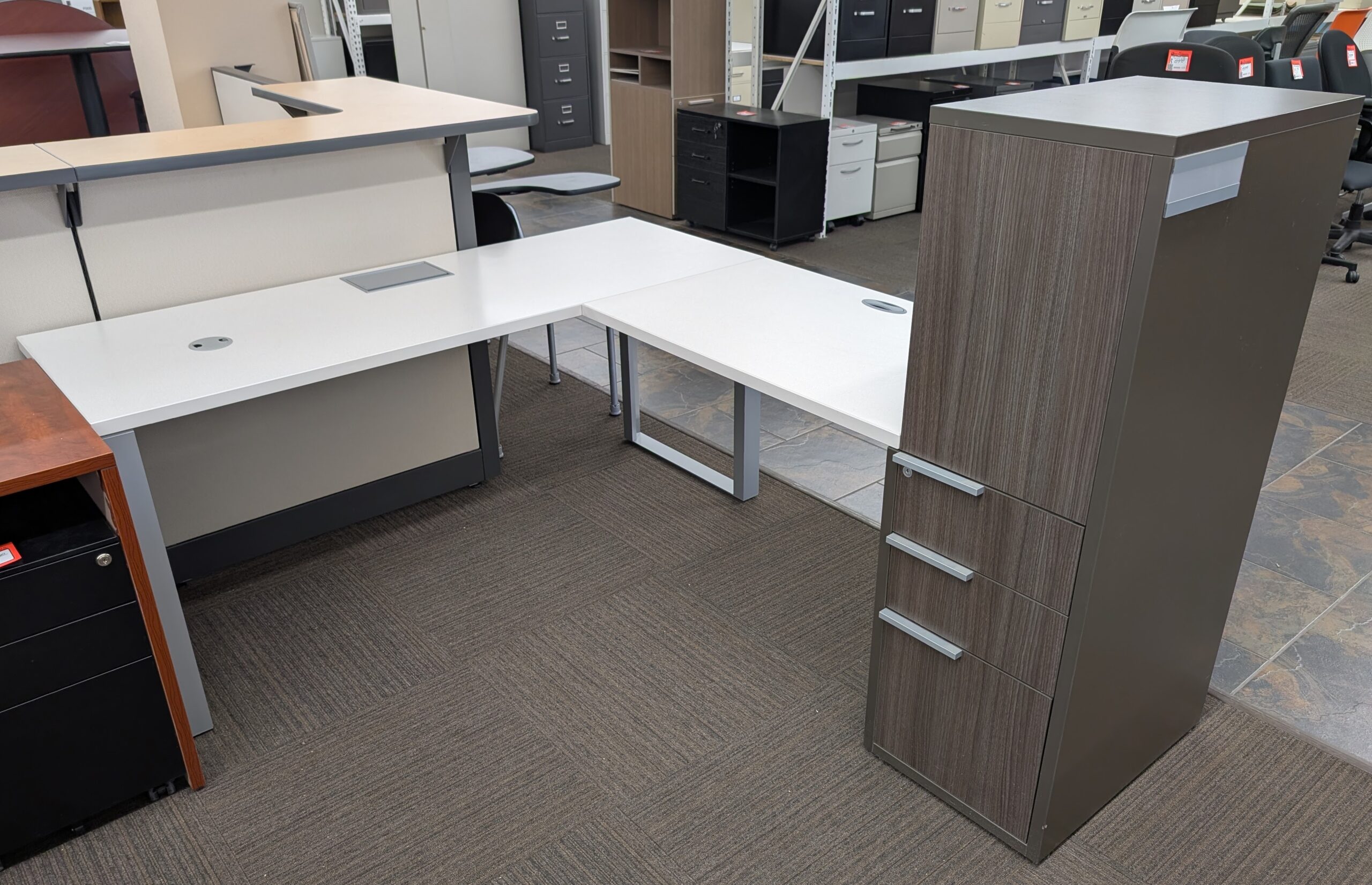 White/Silver/Grey 66″x78″ Desk Set w/ Storage Tower – Used