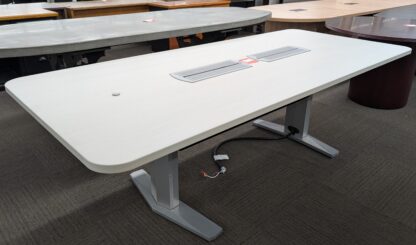 White Wood Grain 8’x42″ Conference Table w/ Silver Base & Grommets – Used